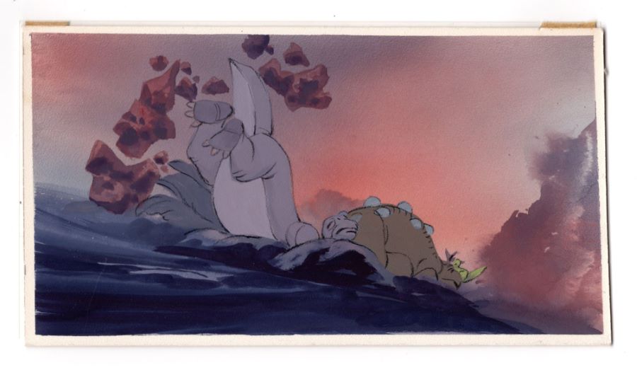 A background color key concept painting from the Don Bluth Studios production of "The Land Before Time" (1988). Featuring Littlefoot, Spike, and Petrie struggling through the tar pit, the hand-painted concept was created at the studio and used during the early production of the film. The concept was used to develop and finalize the color palette for the scene, the layout of the action, and the overall feel of the scene. When a color concept is finalized during production, it becomes the reference tool that animators would use to paint cels and backgrounds, as well as to further progress through the storyboarding and layout of the individual scenes. Measuring 3.75"x7.25" overall, the concept is in fine condition.