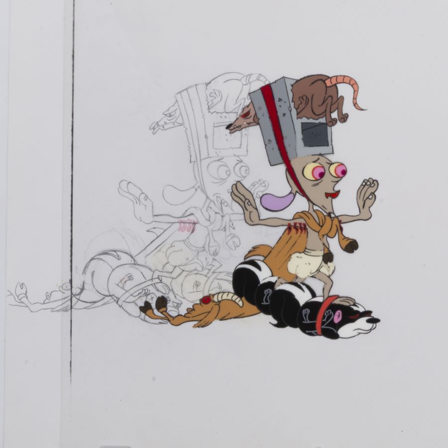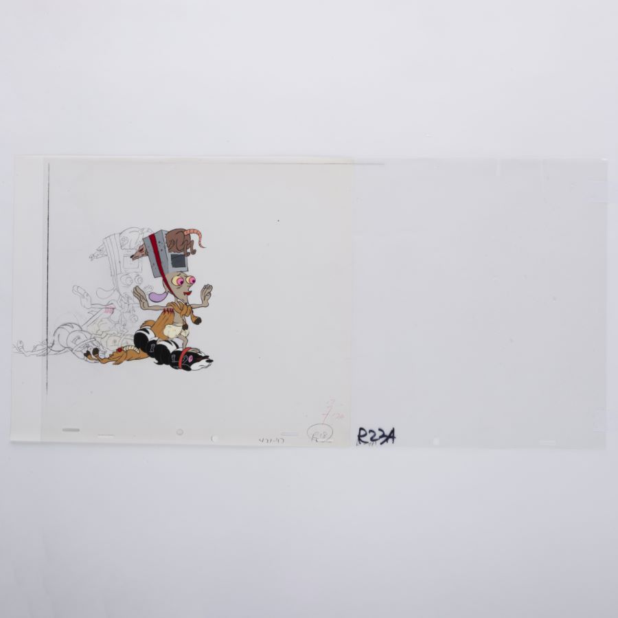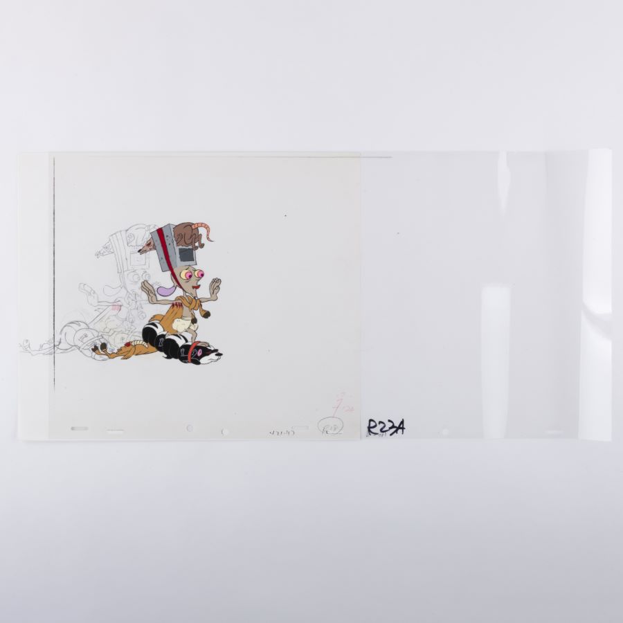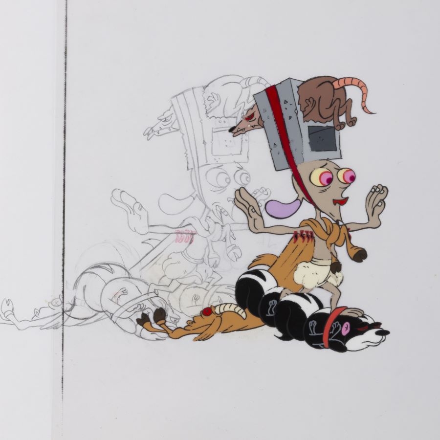 A production cel and non-matching drawing from the Nickelodeon Studios animated series “The Ren & Stimpy Show” (1991-1996). Featuring Ren layered with roadkill to attempt to control his unlucky fate, the hand-painted cel and graphite drawing were created at the studio and used during the animation process. The cel is an actual frame of animation that was photographed and appears in the episode titled “Superstitious Stimpy,” which aired on April 1, 1995. The cel measures 10.5”x20.5” and the drawing 10.5”x12.5”, both with a character image size of 5.25”x4.57”. The cel and drawing are in very good condition with light scratches, paint and black line fade, minor curling and creasing to the right edge of the cel, and minor age-related edge and corner wear to the drawing.