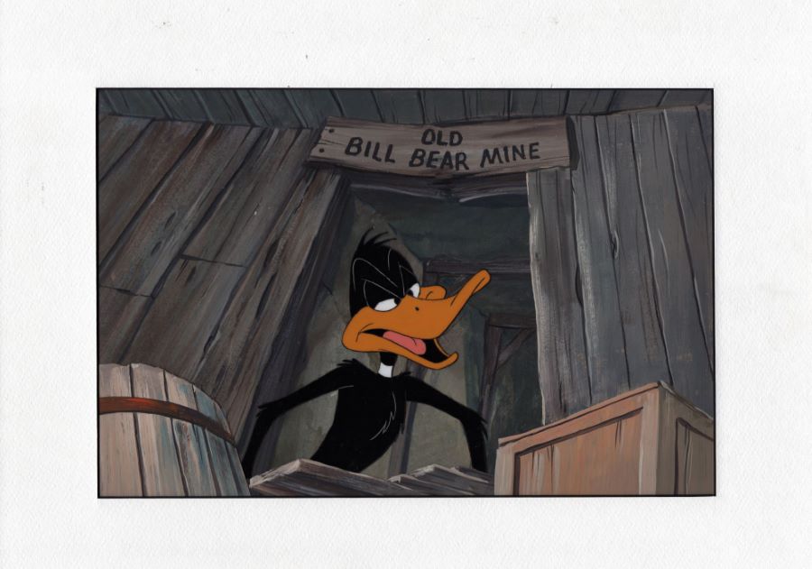 A production cel from a 1980s Warner Bros. Studios animated cartoon with Daffy Duck. Featuring Daffy looking appropriately annoyed, the hand-painted cel was created at the studio and used during the animation process. The piece is an actual frame of animation that was photographed and appears in the cartoon. The cel is paired with a hand painted production background of “Bill Bear Mine” from an unknown production. Measuring 12”x16” matted, with the mat opening measuring 8”x12” and the character image measuring 5.25”x5”, the setup is in very good condition with surface and edge wear from age and handling. The cel layer with Daffy is roughly trimmed to 8.5”x12.5” and has some line wear.